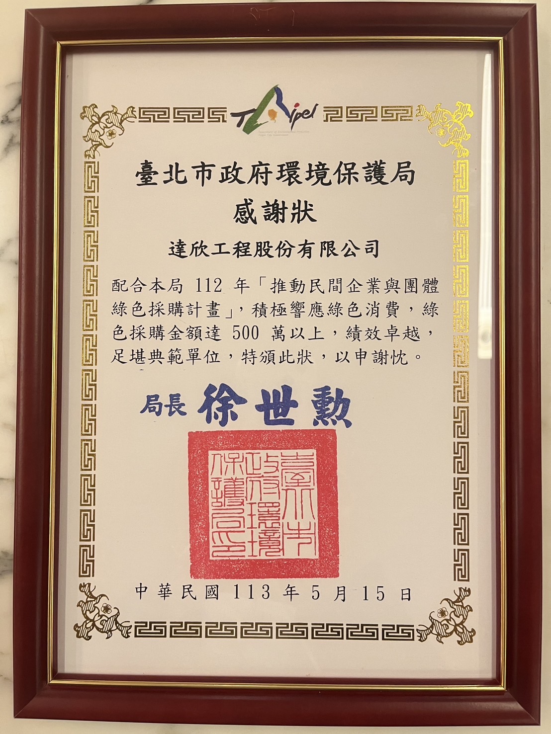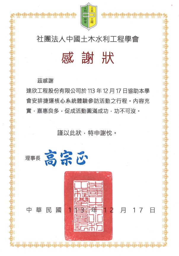 協助社團法人中國土木水利工程學會安排捷運核心系統體驗參訪活動之行程感謝狀