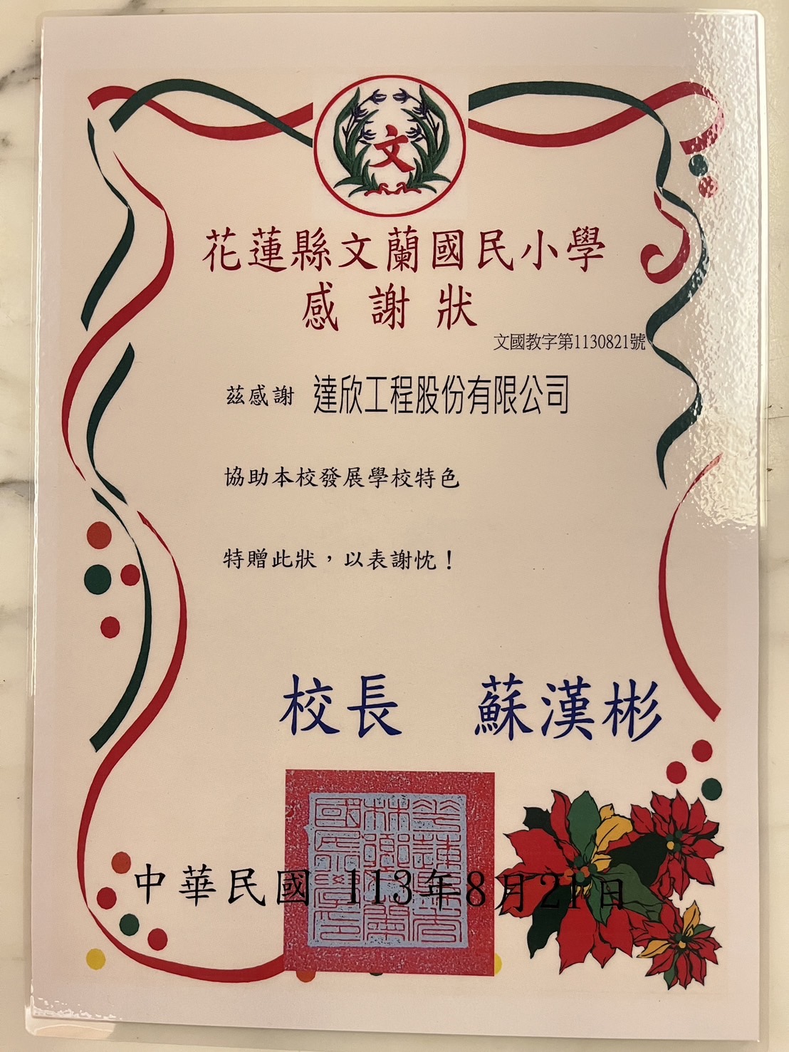 捐助花蓮縣文蘭國民小學發展射箭特色項目經費感謝狀