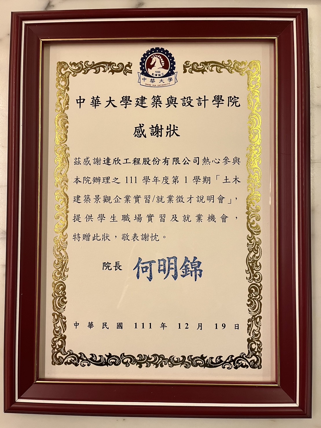参与国立屏东科技大学土木工程系114-1学期校外实习说明会感谢状