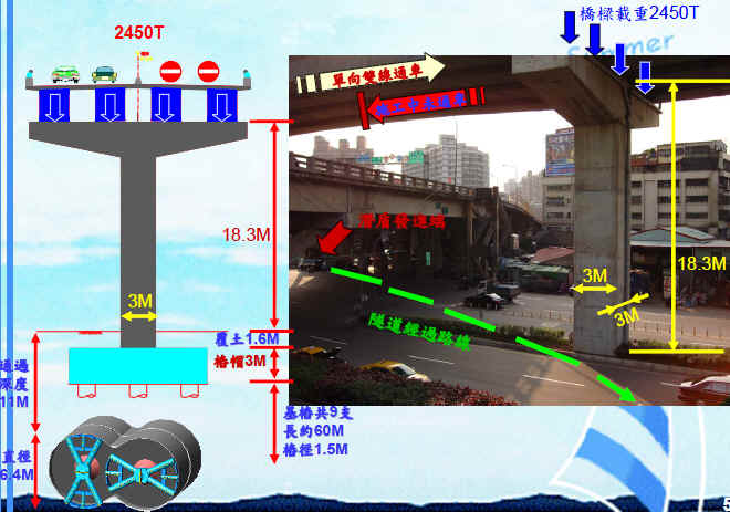 本公司承揽台湾桃园国际机场联外捷运系统CA450A标,本标双圆潜盾(DOT)隧道自三重忠孝桥旁发进,穿越三重环河快速高架道路P64桥墩下方,与桥墩基桩发生冲突,必须先进行桥墩托底工程,潜盾机方可顺利通过。施工过程采自动化安全监测系统,各仪器之监测数据由计算机自动撷取与记录,经由网络可获得实时数据。