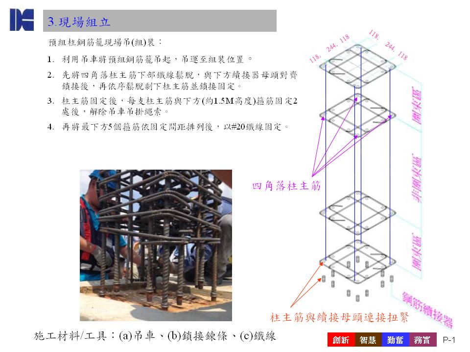 预组柱钢筋笼是一笔箍工法预组立的应用,与传统现地组立钢筋笼施工法比较,可提高柱围束箍筋量,并减少人为组装的误差,对于6m以上层高之柱钢筋,更能凸显其施工与安装之便利性。达欣工程在高科技厂房及高质量住宅建案,已实行此工法多年,确保客户能获得最佳质量及工期效益。