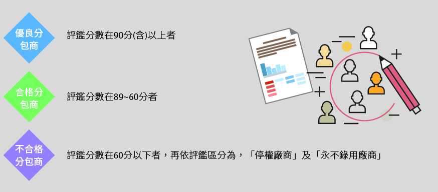 達欣彙整近3 年評鑑結果,轉予採購部做後續採購參考。依據評鑑結果評定為優良供應商者,除得列為優先議比價廠商、保留款可依原招標條件減少50% 外,若最終議比價結果高於其他合格廠商5% 以內時,仍可經評估後,享有優先承攬權。