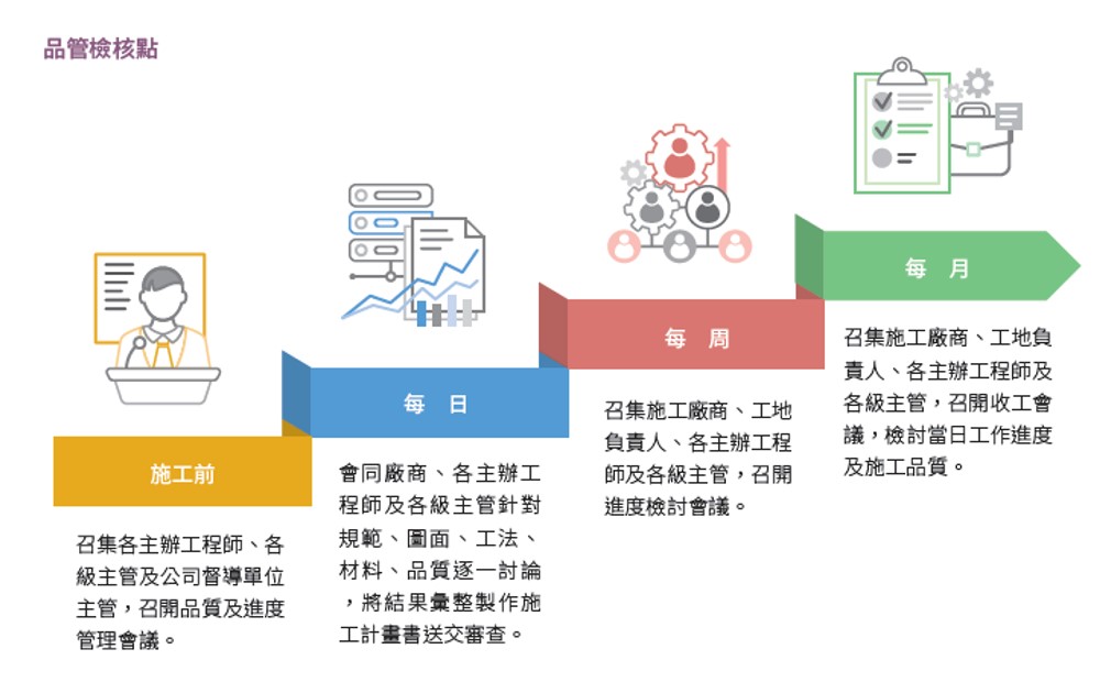 達欣為確保各專案品質無虞,建置以執行長為首三級品質管理組織,在專案推動過程中,藉由規劃、施工執行、查核管理及矯正改善活動,落實品質管理工作,建立自主管理的品質精神,將全員品管的目標內化為公司的企業文化。