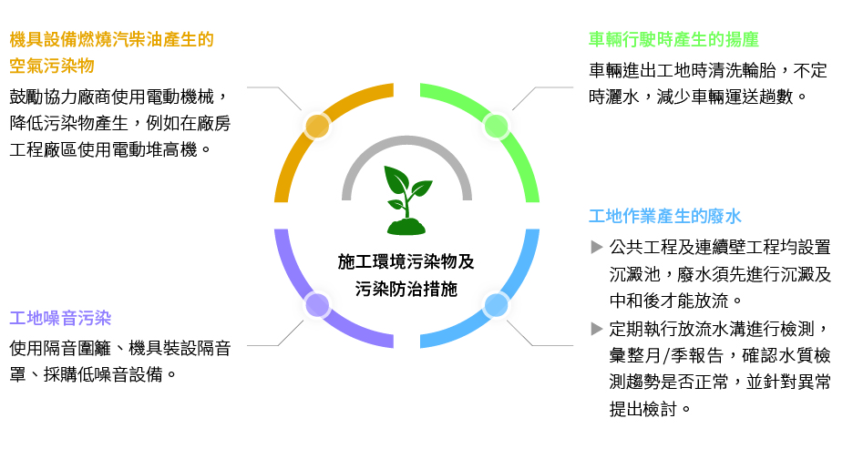 達欣於執行公共工程時,均於開工前執行工地噪音、空污、廢水檢測,且依規定實施定期檢測,確認工地造成的環境影響,實施必要的衝擊防護工作,確保工地與環境的平衡共存。