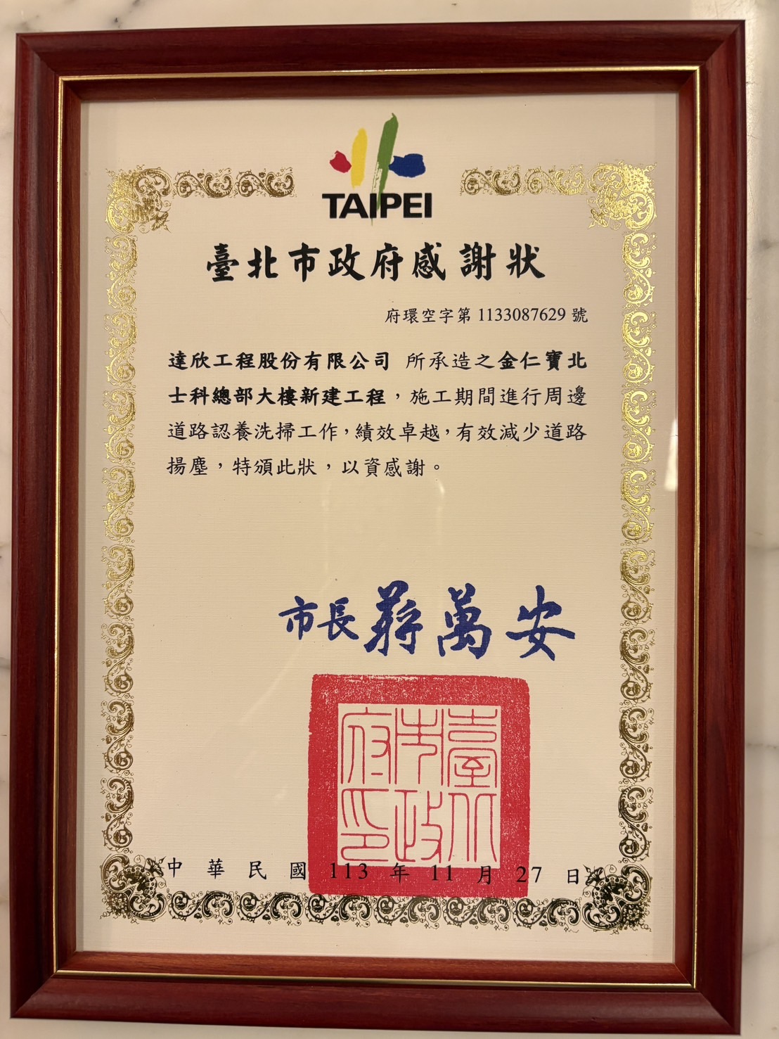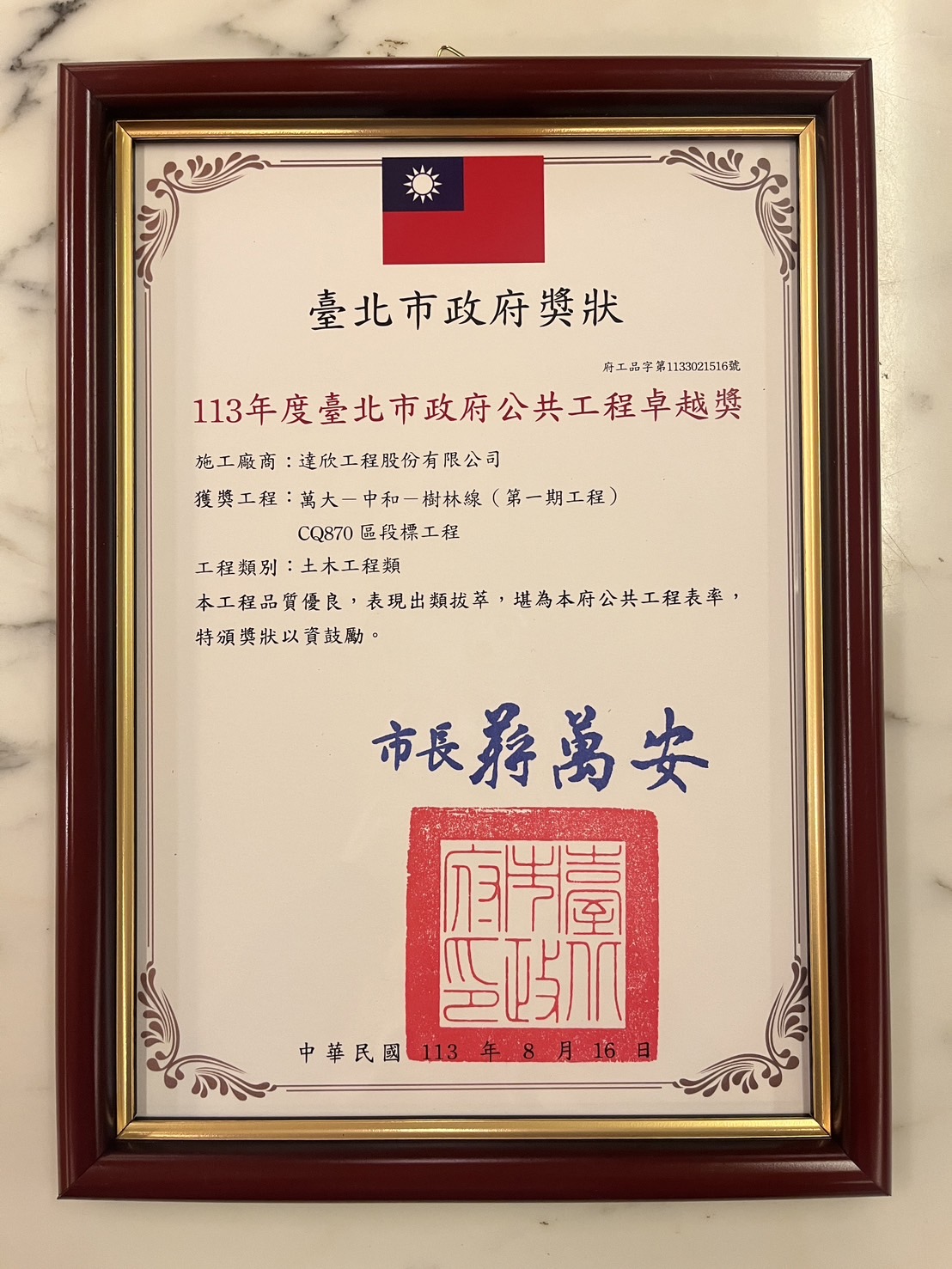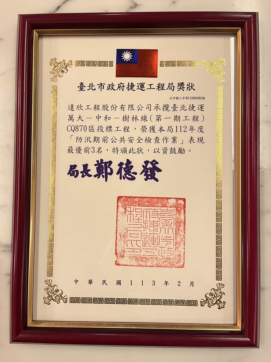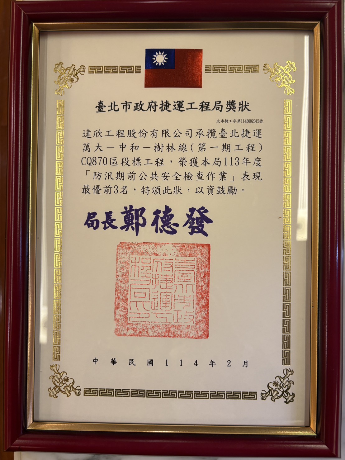 2024.02 Awarded by the MRT Engineering Bureau of the Taipei City Government.