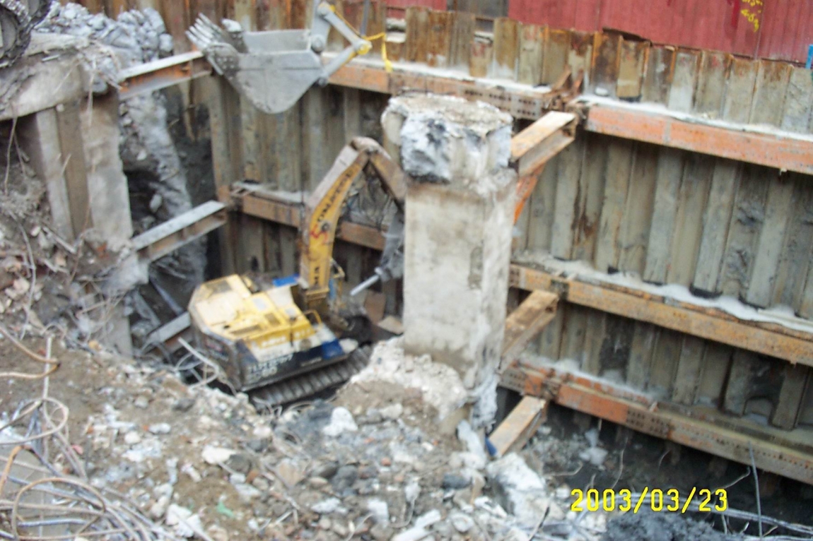 本建案位於台北市交通要道旁及屬極軟弱地盤,原為地下二層/地上14層之老舊集合住宅,因921震災受損而重建,新建大樓為地上13層、地下5層之SRC大樓,地下室開挖面積及深度分別約為1,900m2及21.75m,連續壁的厚度及深度分別為100cm及43m,採順打工法開挖。因新大樓須維持原建築容積,故新設擋土壁除小部份在舊地下室外側、大部份則與舊地下室外牆重疊,且新設擋土壁外緣緊貼地界線,因此本案之挑戰在於新設擋土連續壁與原建物地下室外牆重疊時之深導牆的施工,且基地位於台北市交通要道旁屬極軟弱地盤,故施工期間的安全與品質管控要求極高。