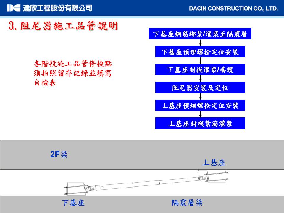 當結構受到地震外力時,可藉由功能轉移來抵銷外力對結構所造成的傷害。高樓層建物採用隔震系統,在地震頻繁的台灣,為一經濟且安全之設計,除能減少結構梁柱尺寸之浪費,增加建築美感,也能保障受震時的高安全性。為確保隔震系統之良好運作,在材料試驗及現地安裝上都必須做到精準無暇,對從業人員的教育訓練到現地施工操作與管理,皆需按步驟反覆查核,方能完成任務。