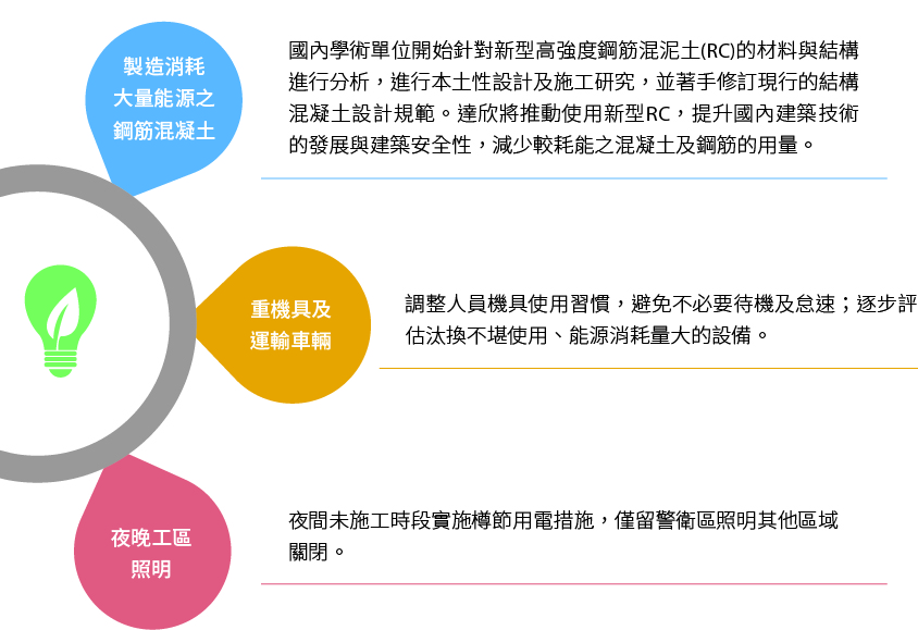 因營建工程工務所、夜晚工區照明設備及施工設備消耗大量電力能源,達欣 2024 年全年工地用電度數達 2,990,851 度(用電量波動係因工進、專案階段不同而有不同水準之耗電量,屬營造業特性)。此外,工程使用的鋼筋及混凝土,於製造時需耗費大量能源;施工重機具及運輸車輛,多為燃燒汽柴油的設備,均為較大耗能源。
