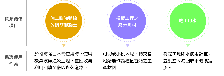工程施工所使用的主要材料,如混凝土、鋼筋、鋼構,採購時,除符合政府相關法規及業主合約規範,使用經檢試驗合格之材料,並響應政府的循環經濟政策( 供應商添加飛灰、爐石粉符合強度要求範圍,以節用能資源),訂定定期抽查機制,管控材料使用數量,在建築結構穩固安全的前提下,盡可能使用可再生原料,及經回收後可為建材之再生料,以自身做起,落實本業可行之循環經濟作為。
